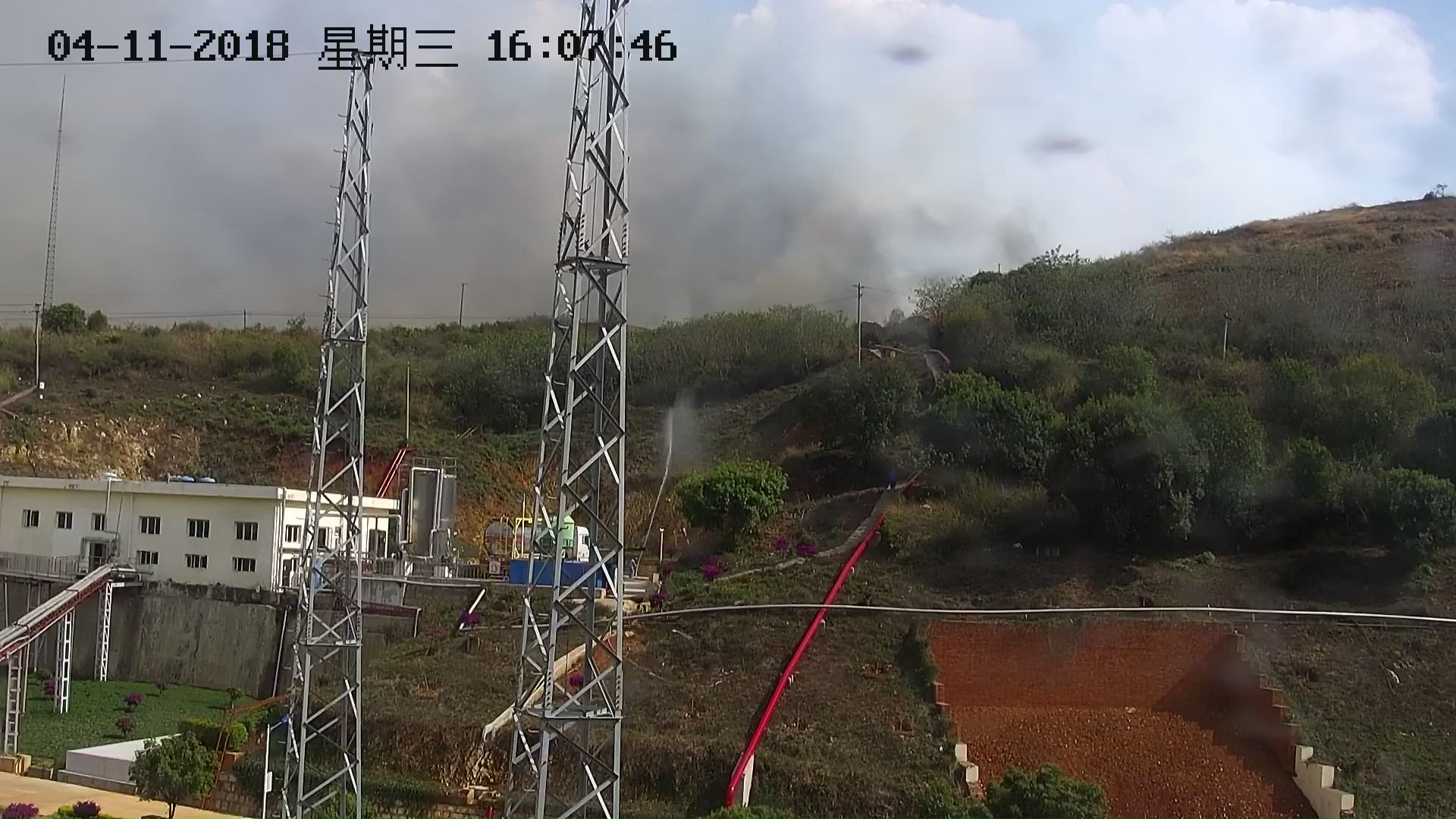 4月11日15:30生產(chǎn)區(qū)水油相制備工房旁圍墻外突發(fā)山火,由于近日來天氣晴朗正直午后氣溫達(dá)到30℃,西南風(fēng)3-4級,火勢迅速蔓延擴(kuò)大,市森林消防隊(duì)向開遠(yuǎn)分公司請求支援。分公司負(fù)責(zé)人接到通知后立即組織人員成立臨時應(yīng)急救火小組,攜帶救援器材趕往生產(chǎn)區(qū)高位水池處連接水泵撲救山火,同時生產(chǎn)車間立即安排人員對水油相制備工房外圍噴水造濕,以防萬一。