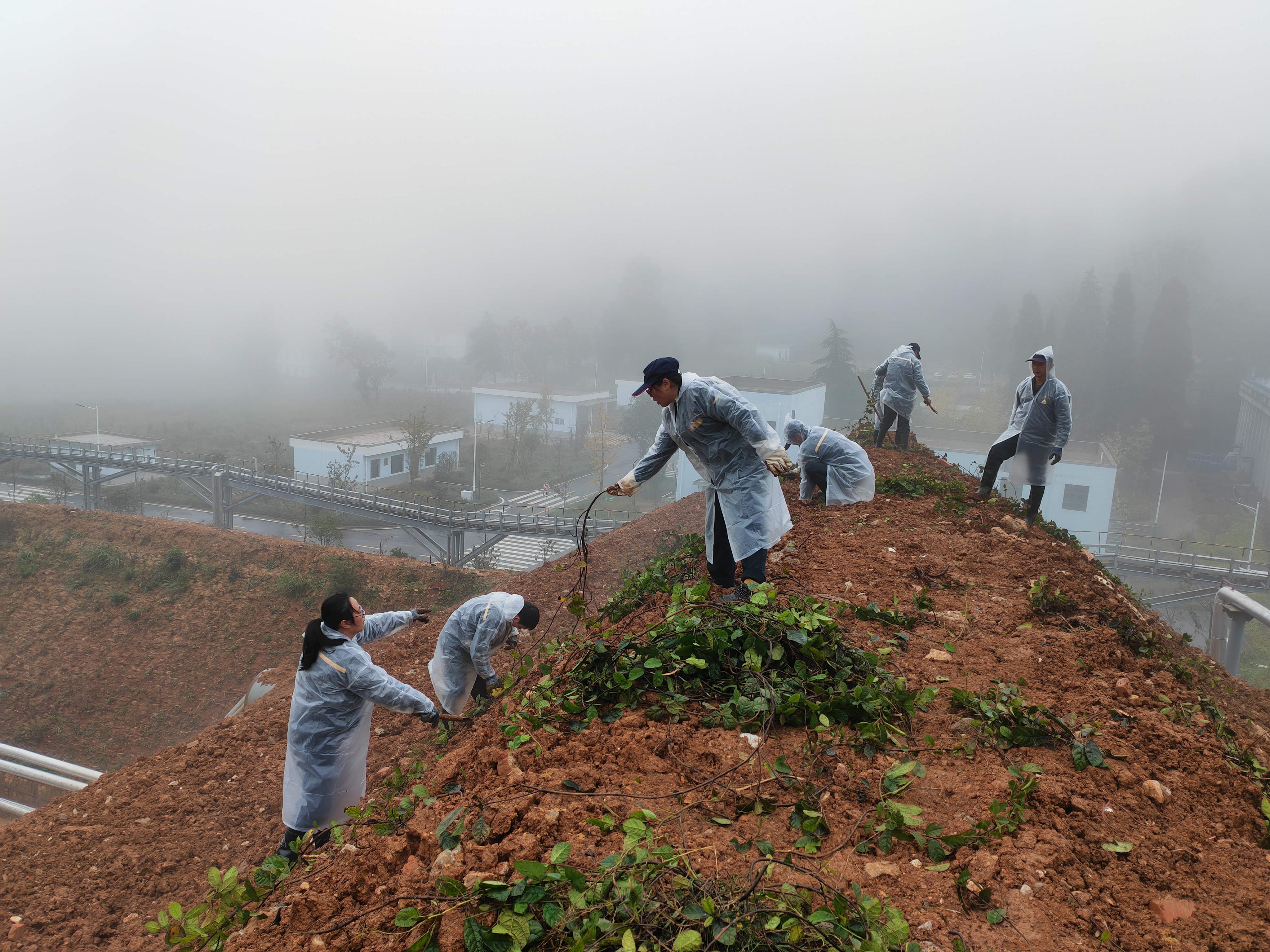 活動(dòng)當(dāng)天是二十四節(jié)氣中的“霜降”,大凹塘氣溫再降,陰雨綿綿,黨員同志們積極響應(yīng)黨支部號(hào)召,如約而至。經(jīng)過簡單分工,有的黨員負(fù)責(zé)到老生產(chǎn)線挖地石榴藤,并搬運(yùn)藤到新生產(chǎn)線,有的手持鐮刀挖坑栽種,大家分工協(xié)作、現(xiàn)場一片熱火朝天的景象。活動(dòng)中大家的鞋子和褲腿沾滿泥土,臉上分不清是雨水還是汗珠,但依然擋不住大家對(duì)植綠護(hù)堤的熱情,各個(gè)精神飽滿、干勁十足,充分發(fā)揮黨員的模范帶頭作用。經(jīng)過同志們一個(gè)上午的共同努力,光禿禿的土堤上點(diǎn)綴上了點(diǎn)點(diǎn)綠色。