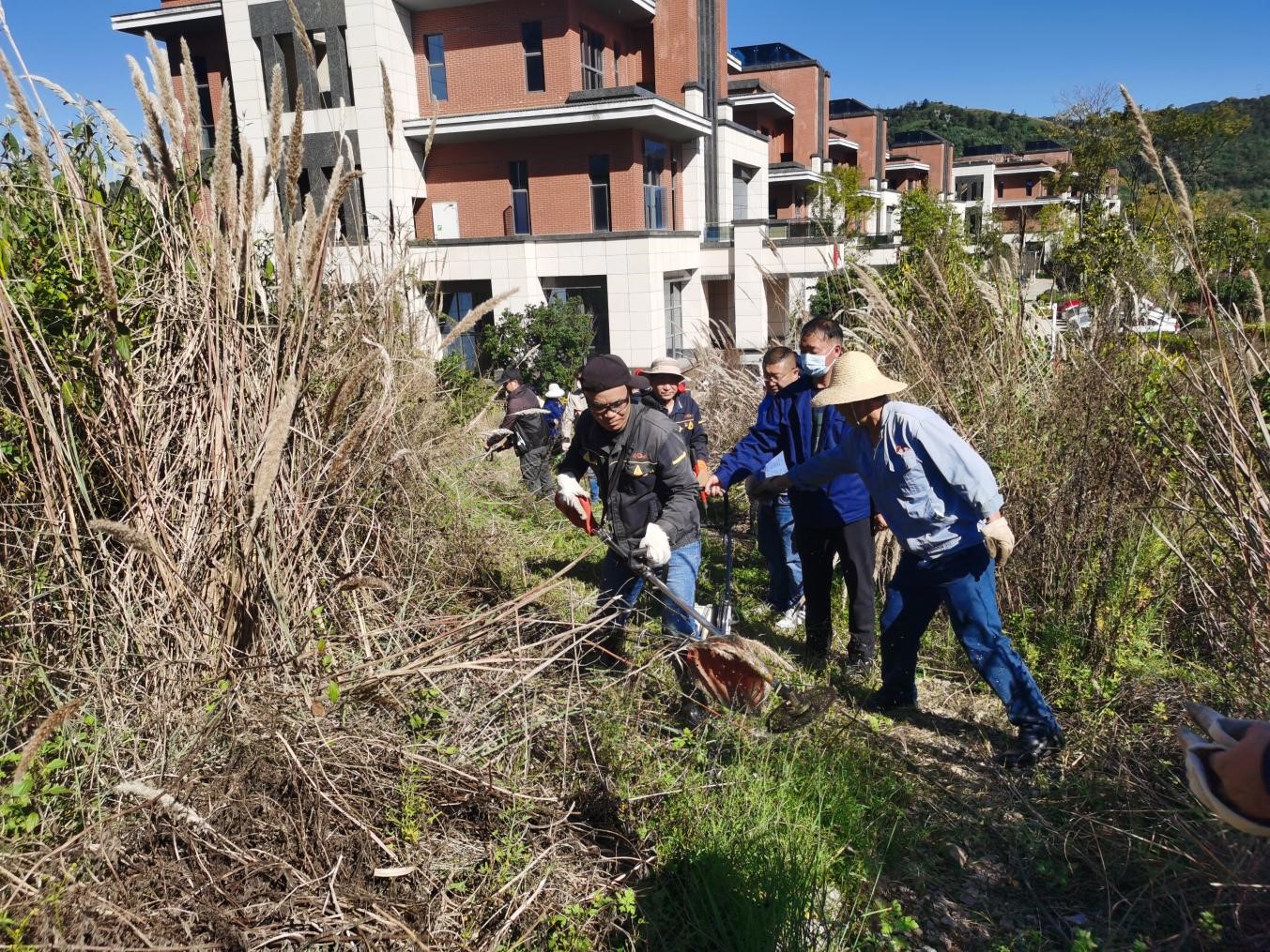 當天大家頂著炎炎烈日,戴著手套,拿著工具對水池周圍一米范圍內的灌木、雜草,樹木進行修枝清理和清除消防泵房周圍一米范圍內雜草。除草區(qū)域分片區(qū)迅速展開除草行動,有的拿鐮刀割、有的拿鋤頭刨、有的用割草機割、有的拿砍刀砍,還有的直接用手,全然不顧泥草沾滿了褲腿,大家興致高昂、分工合作、積極配合,充分發(fā)揮了不怕苦、不怕臟、不怕累的勞動精神,通過三小時的清理原本雜草叢生的水池便煥然一新,回望路邊一個又一個的草垛,大家都露出了開心的笑容。