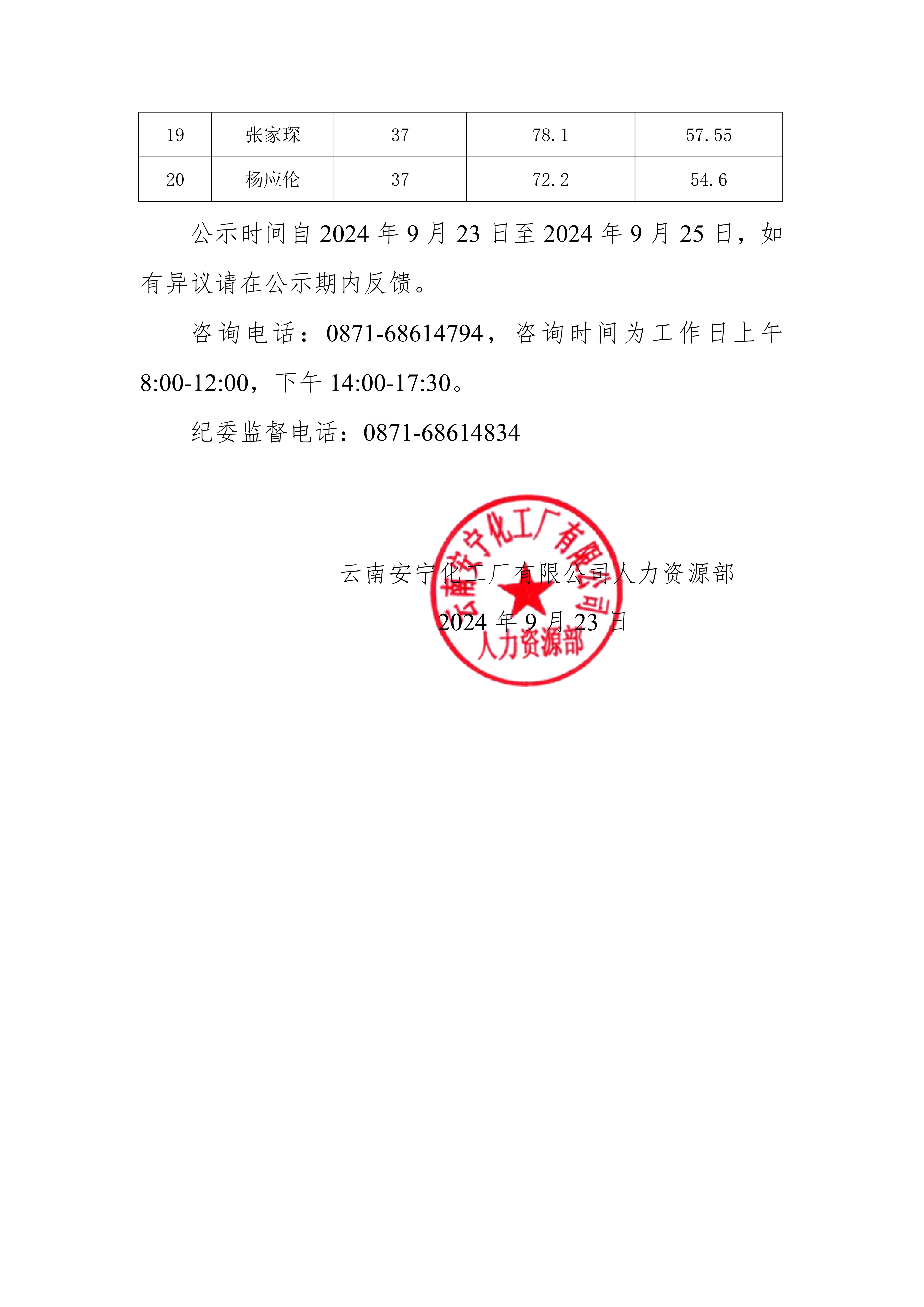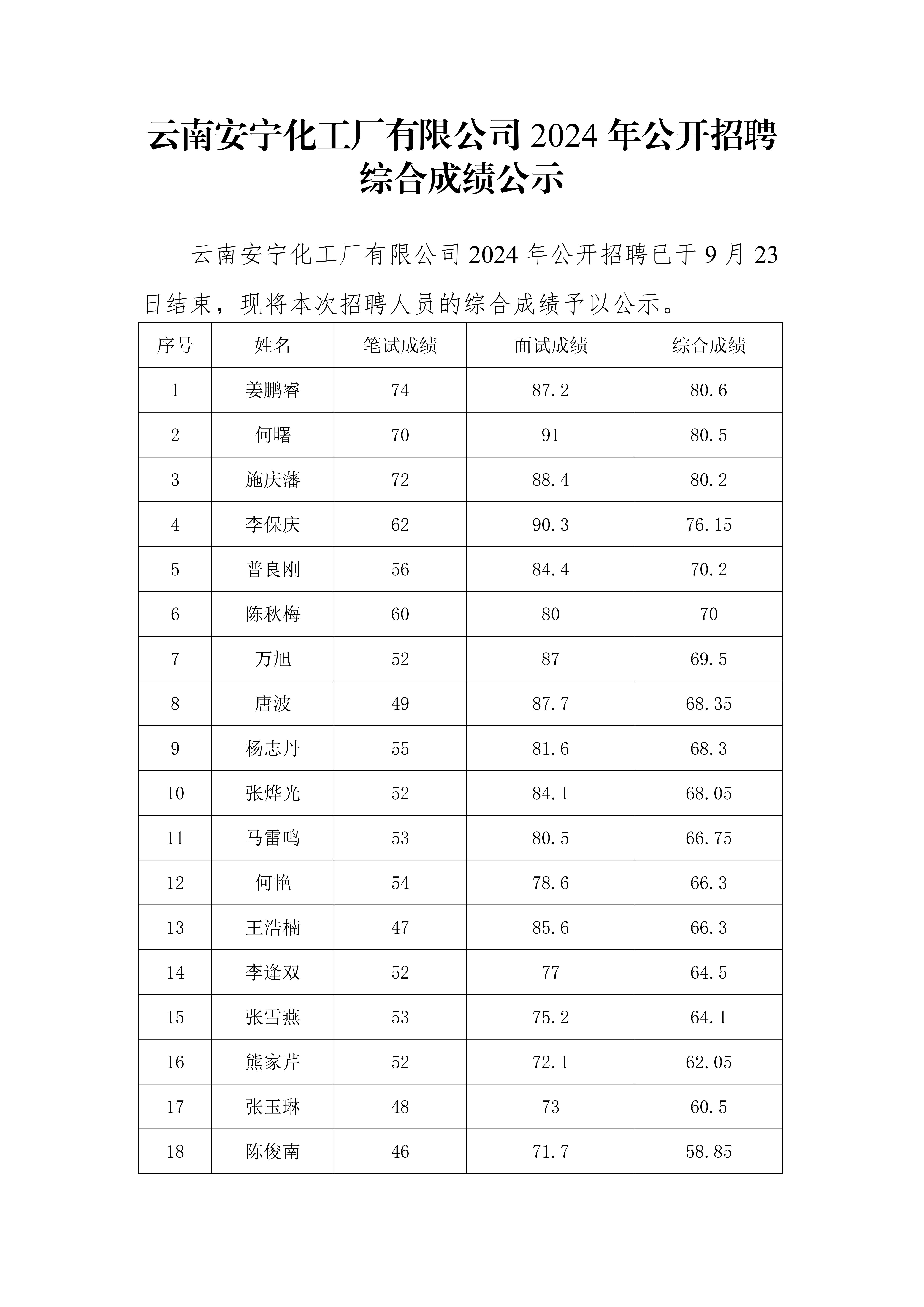 云南安寧化工廠有限公司2024 年公開(kāi)招聘綜合成績(jī)公示